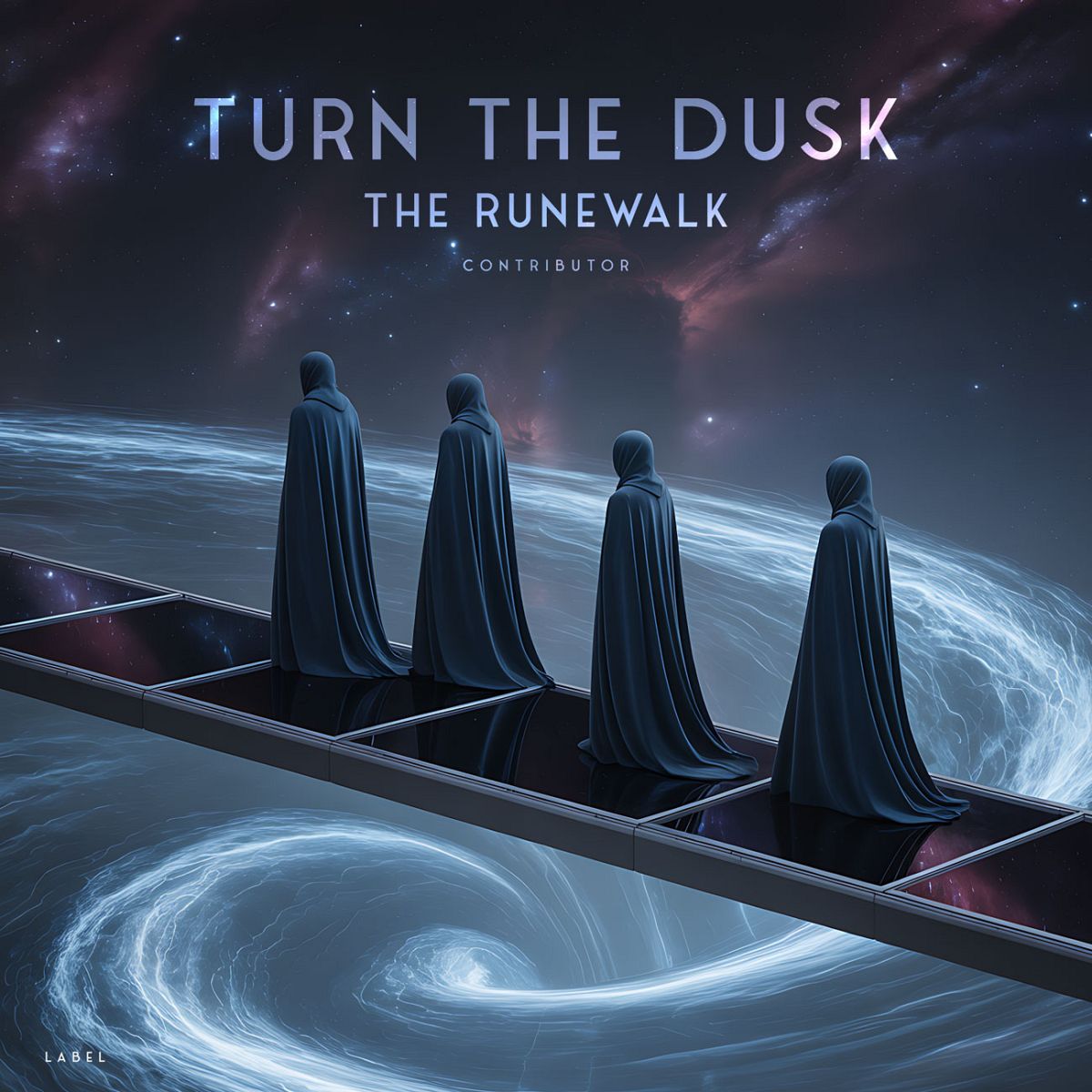 “Four cloaked figures stand on a bridge in a cosmic scene with swirling galaxies and a starry sky.”