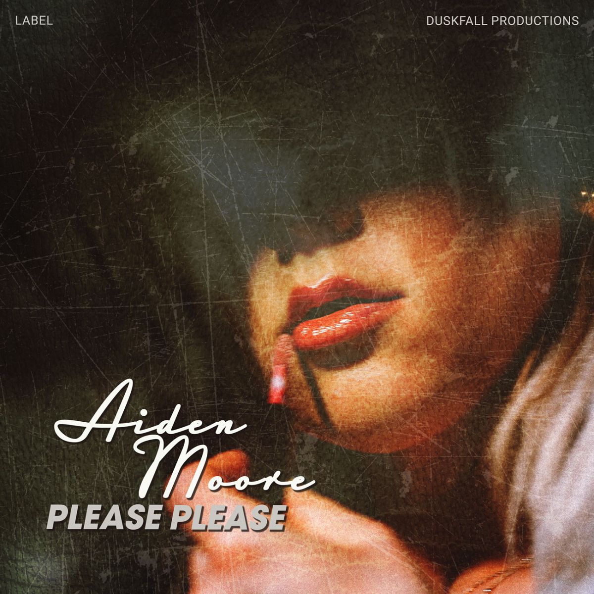 “A women under the shadow applies wearing glossy red lipstick, lips illuminated against a scratched, grungy backdrop.”