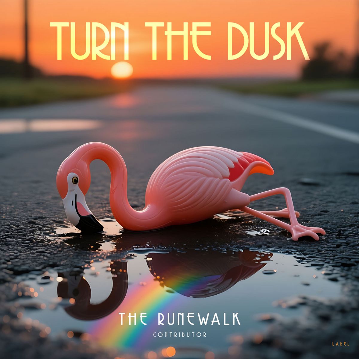 “A pink flamingo figurine stands in a puddle on a road at sunset, reflecting vibrant colors.”