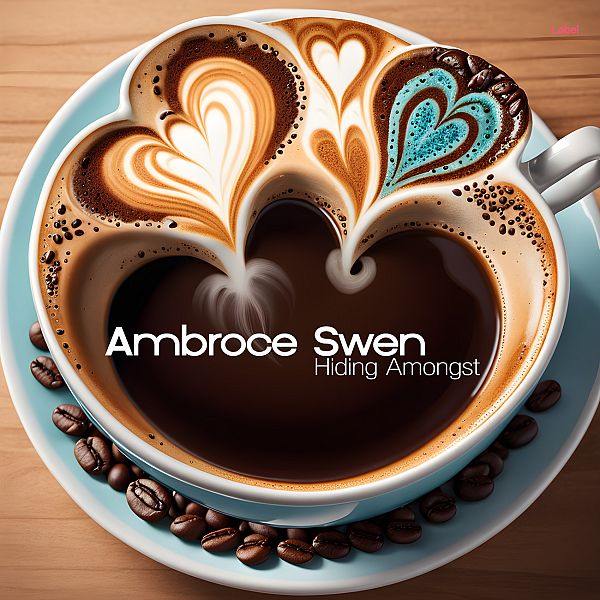 “A cappuccino with intricate heart-shaped latte art in a blue cup, surrounded by coffee beans on a wooden table.”