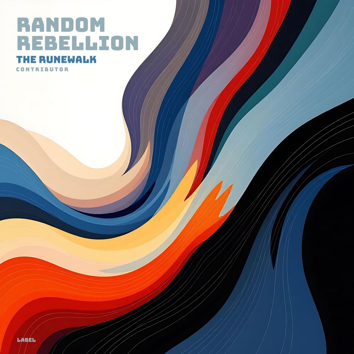 “Abstract waves of colorful curves in red, blue, orange, and black tones.”