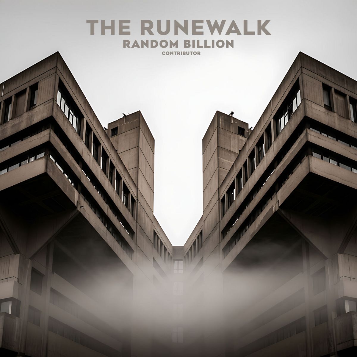“Symmetrical architectural design with a foggy sky backdrop, featuring two converging modern buildings.”