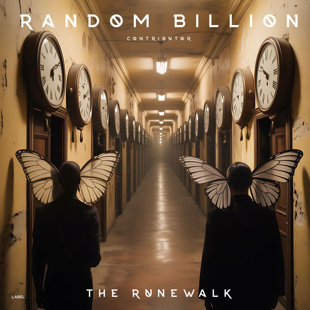 “Two figures with butterfly wings stand in a hallway lined with multiple clocks. The scene has a mysterious, surreal atmosphere.”