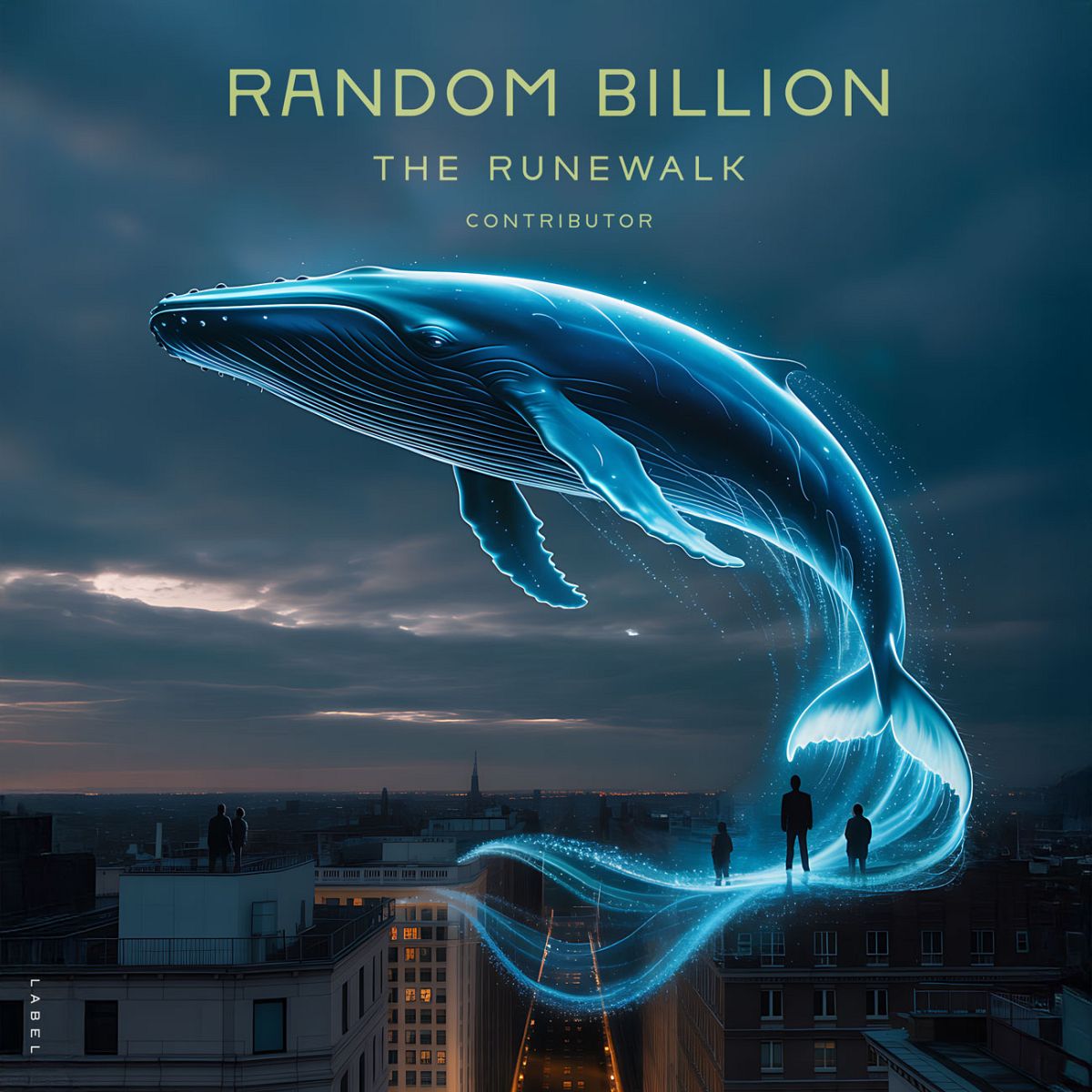 “A glowing whale hovers above a cityscape at dusk, with silhouettes of people looking on.”