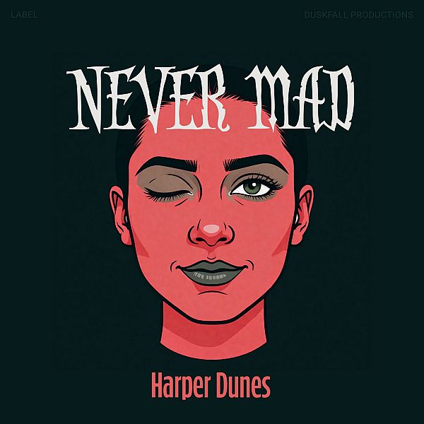 “Illustrated portrait of a person with one eye open, smiling, on a dark background.”
