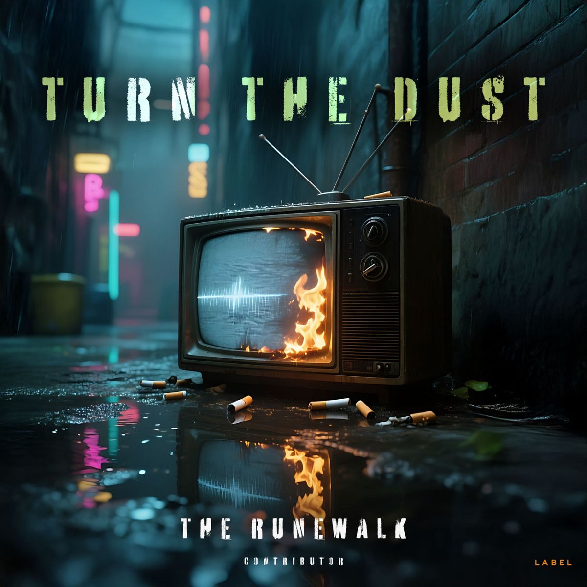 “A retro TV in a wet alley displays a wave pattern. Cigarettes litter the ground, while neon lights glow in the background.”