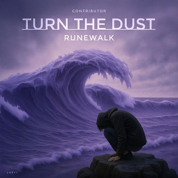 “A person crouches on a rock, facing a giant, curling purple wave under a dramatic, cloudy sky.”