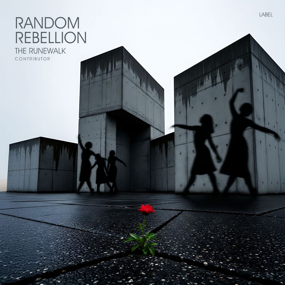 “Futuristic concrete structures with silhouettes of dancing figures, a single red rose growing on a wet pavement.”
