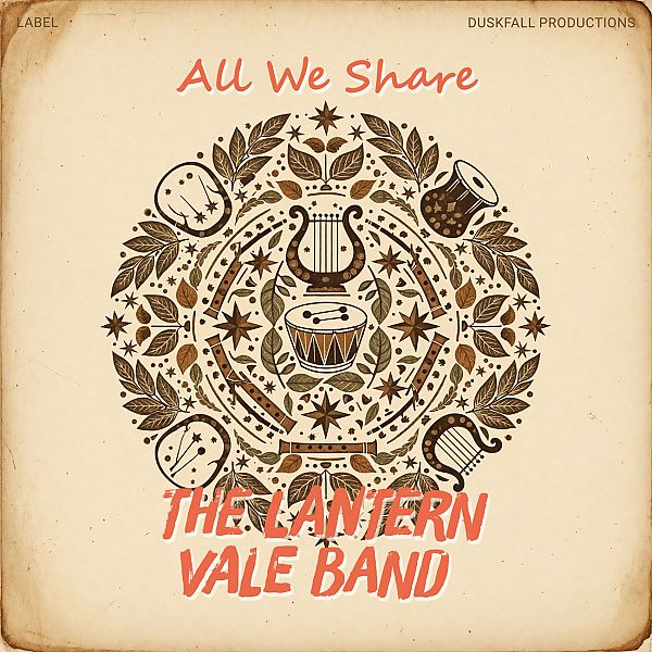 “A circular design featuring musical instruments and leaves in a vintage style.”