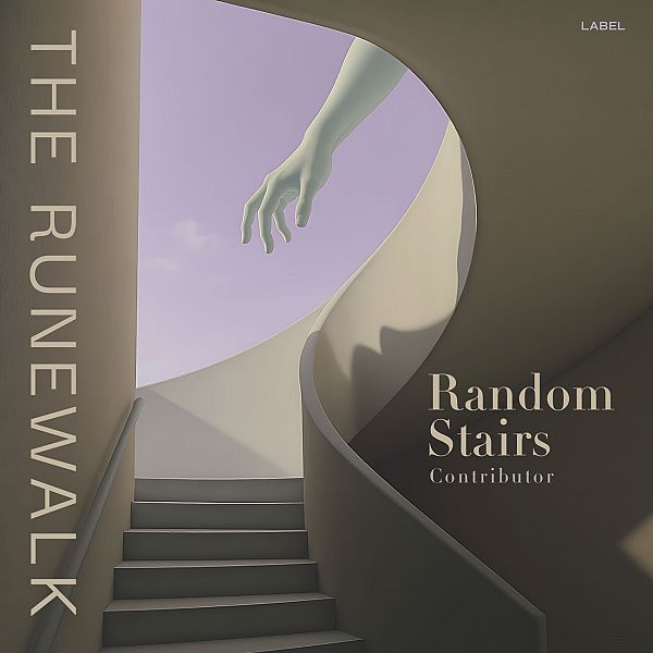 “A spiral staircase curves upwards with a hand reaching towards the sky, set against a purple backdrop.”