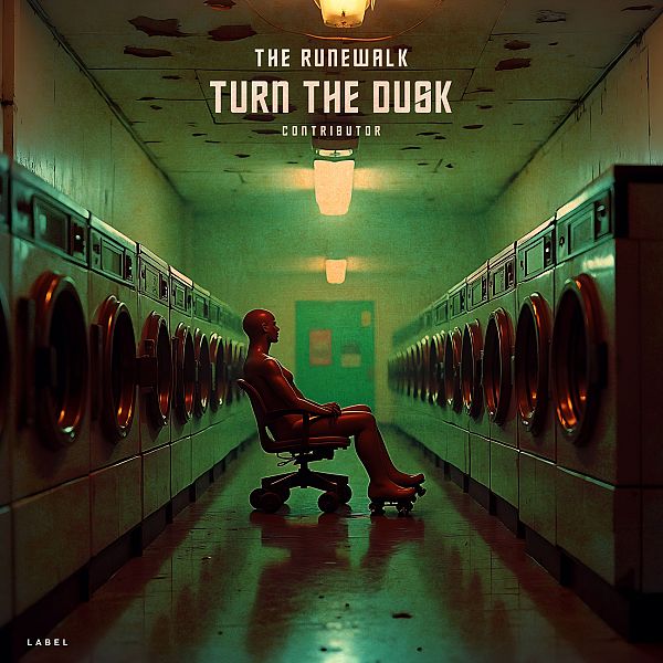 “A person sits in a chair in a dimly lit laundry room, surrounded by washing machines.”