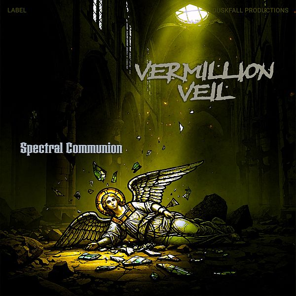 “A shattered stained-glass angel lying amid rubble. A scene of the abandoned cathedral floor. Dark haze with faint luminous fragments.”