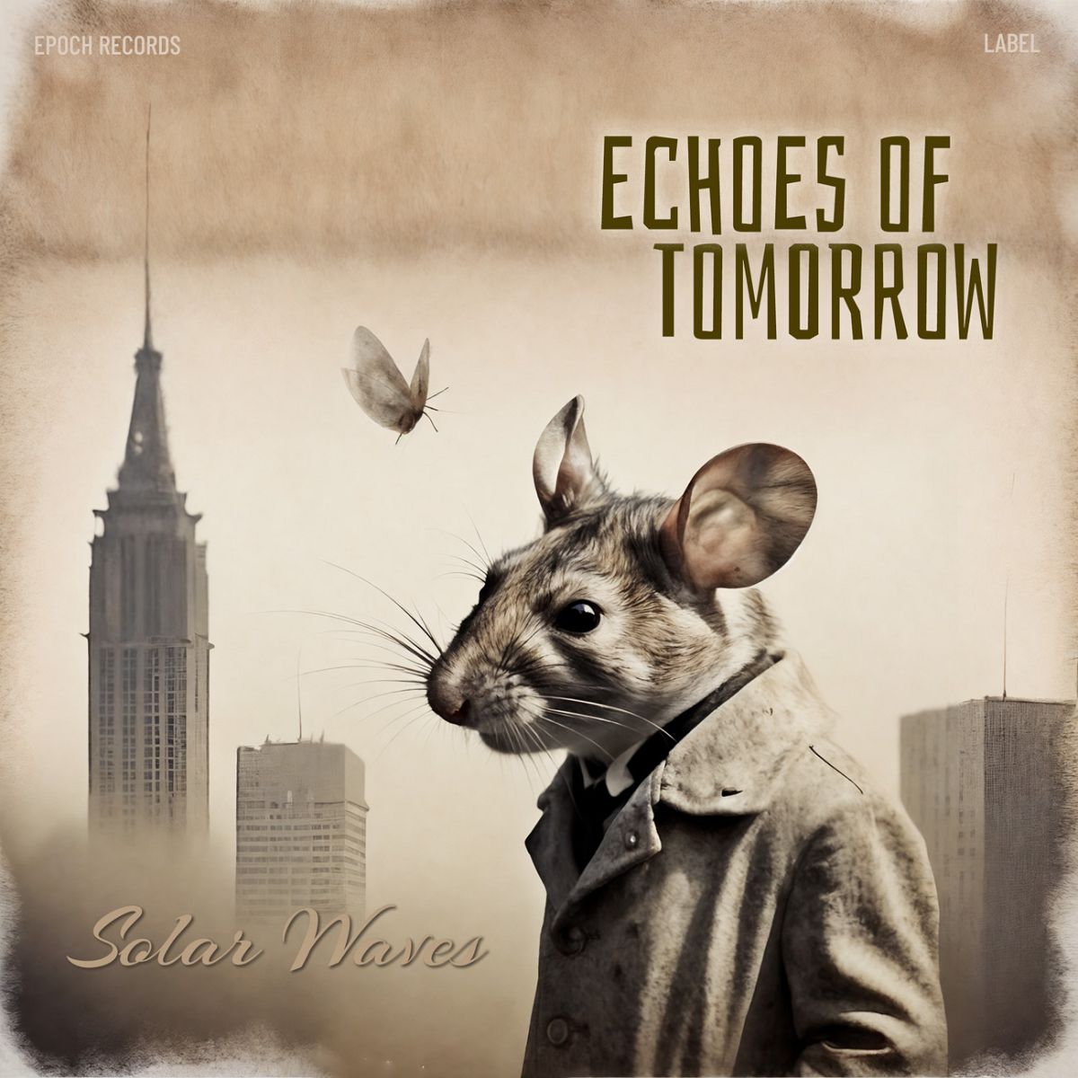 “A mouse wearing a trench coat in a cityscape with skyscrapers and a butterfly.”