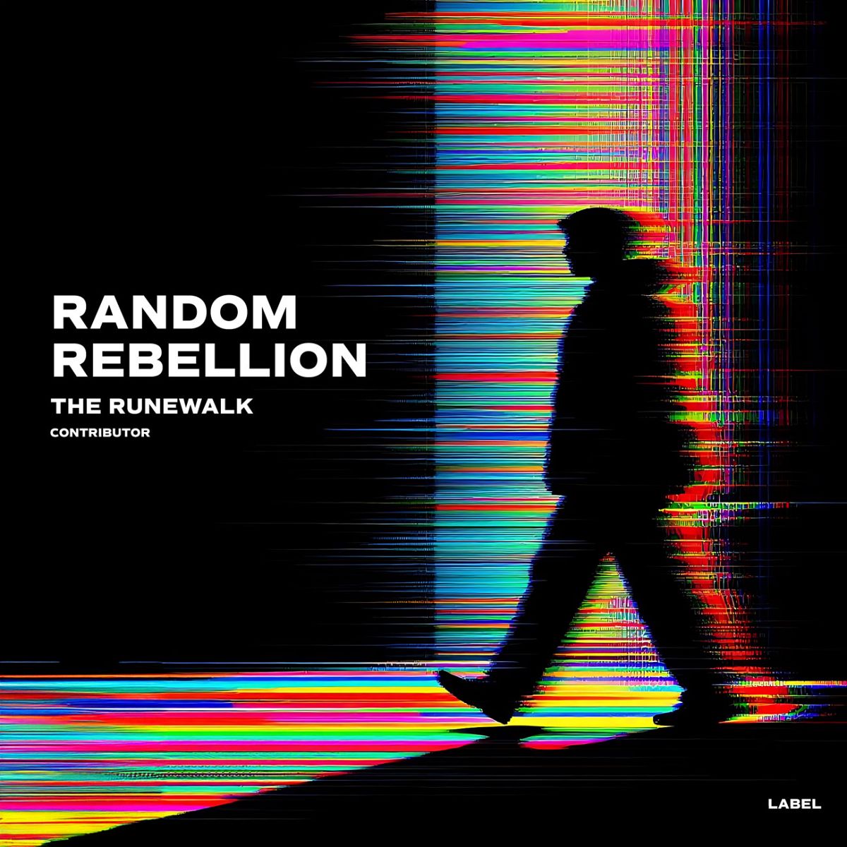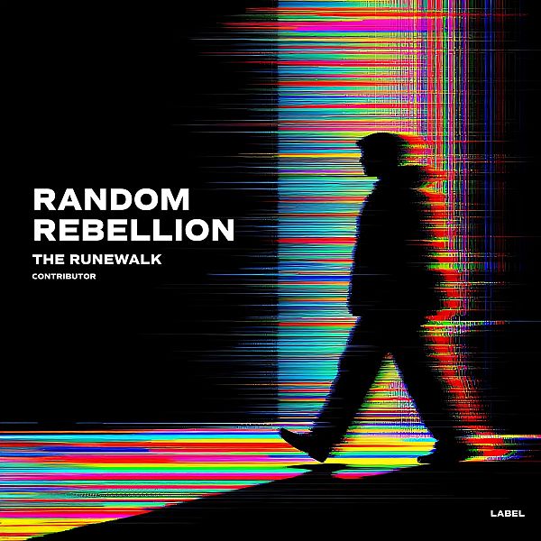 “A silhouette of a walking person with colorful, glitchy horizontal lines in the background.”