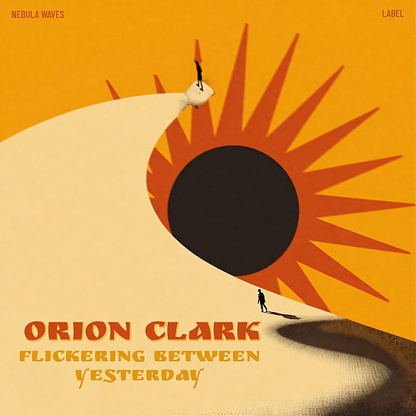 “Abstract sun and desert scene with two silhouetted figures and dynamic shadows.”