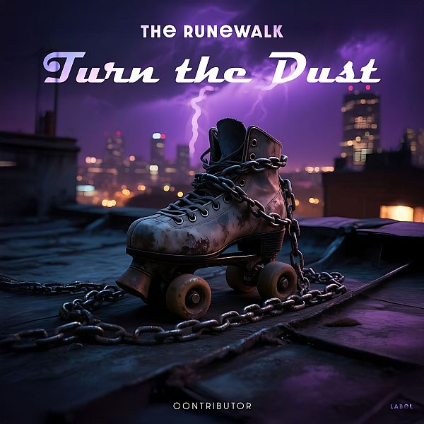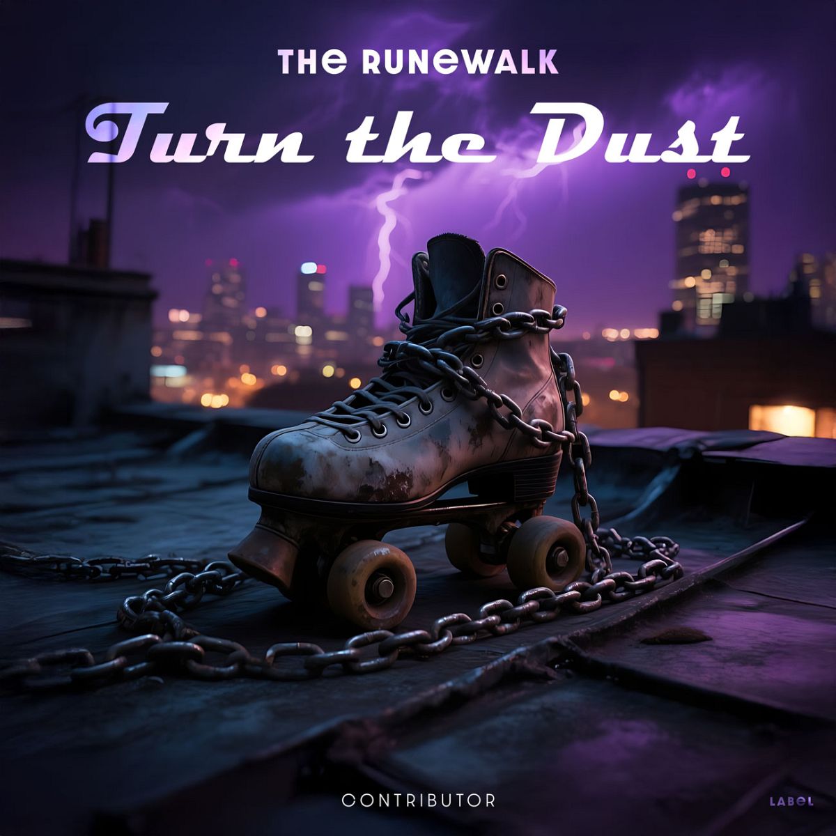 “A chained roller skate sits on a rooftop at night with a city skyline and lightning in the background.”