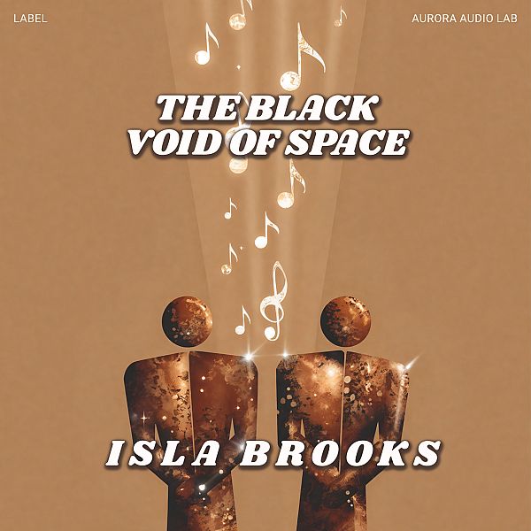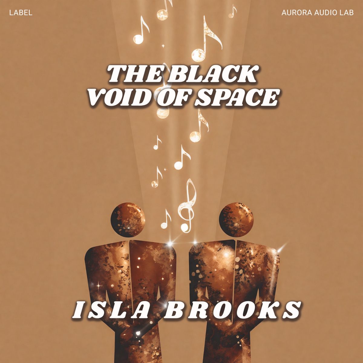 “Two abstract figures with musical notes floating above them against a brown background.”