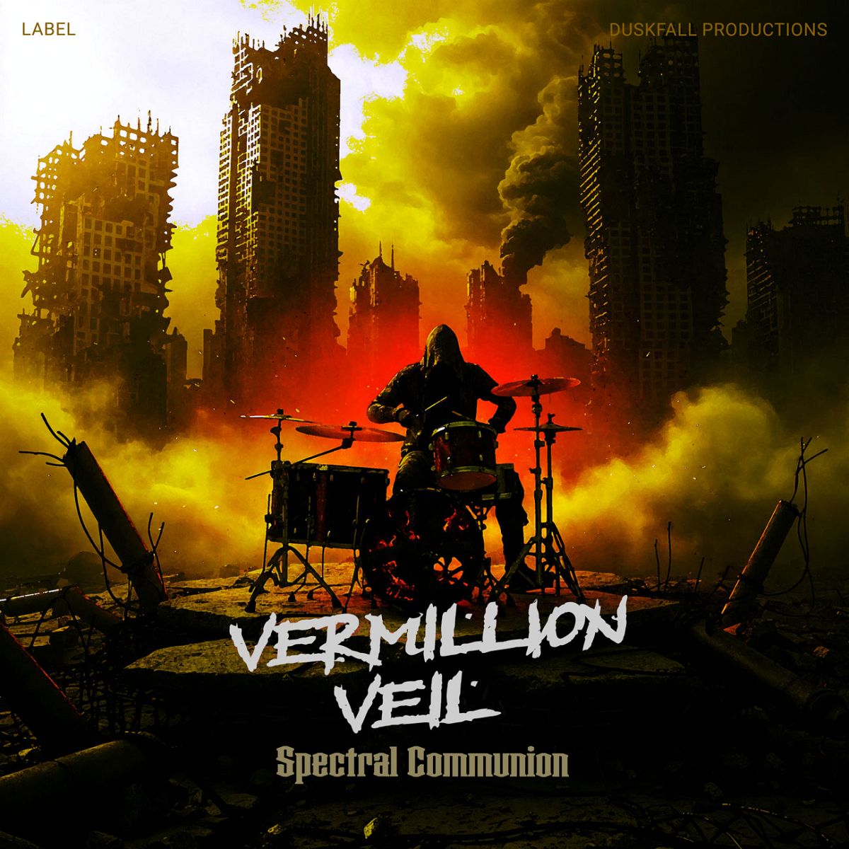 “A cloaked drummer surrounded by crumbling skyscrapers. A scene of stage formed from rubble, smoke swirling overhead.”