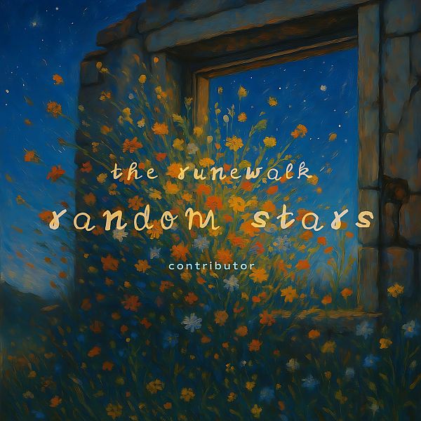 Tags: night, sky, flowers, stars, painting, window, orange flowers, blue sky, stone wall, dreamlike, nature, surreal, glowing, vibrant, outdoors, landscape, art, evening, tranquil, whimsical