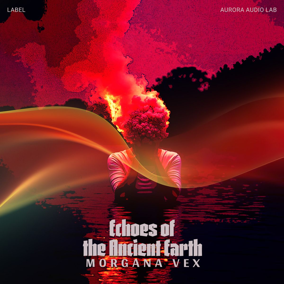 “Psychedelic cover art with vibrant colors, a person holding a glowing orb, surrounded by swirling textures and flames.”