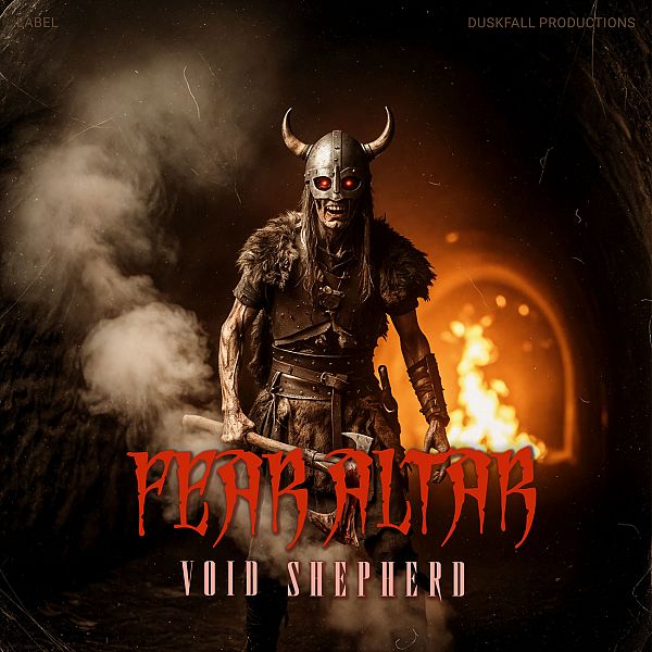 “A warrior with a horned helmet and glowing red eyes stands amidst smoke and fire, holding a spear.”
