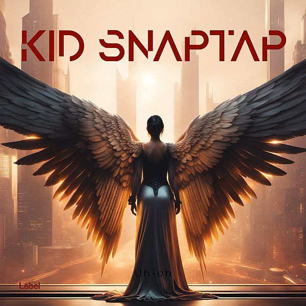 “A figure with angel wings stands before a futuristic cityscape, backlit by glowing skyscrapers.”