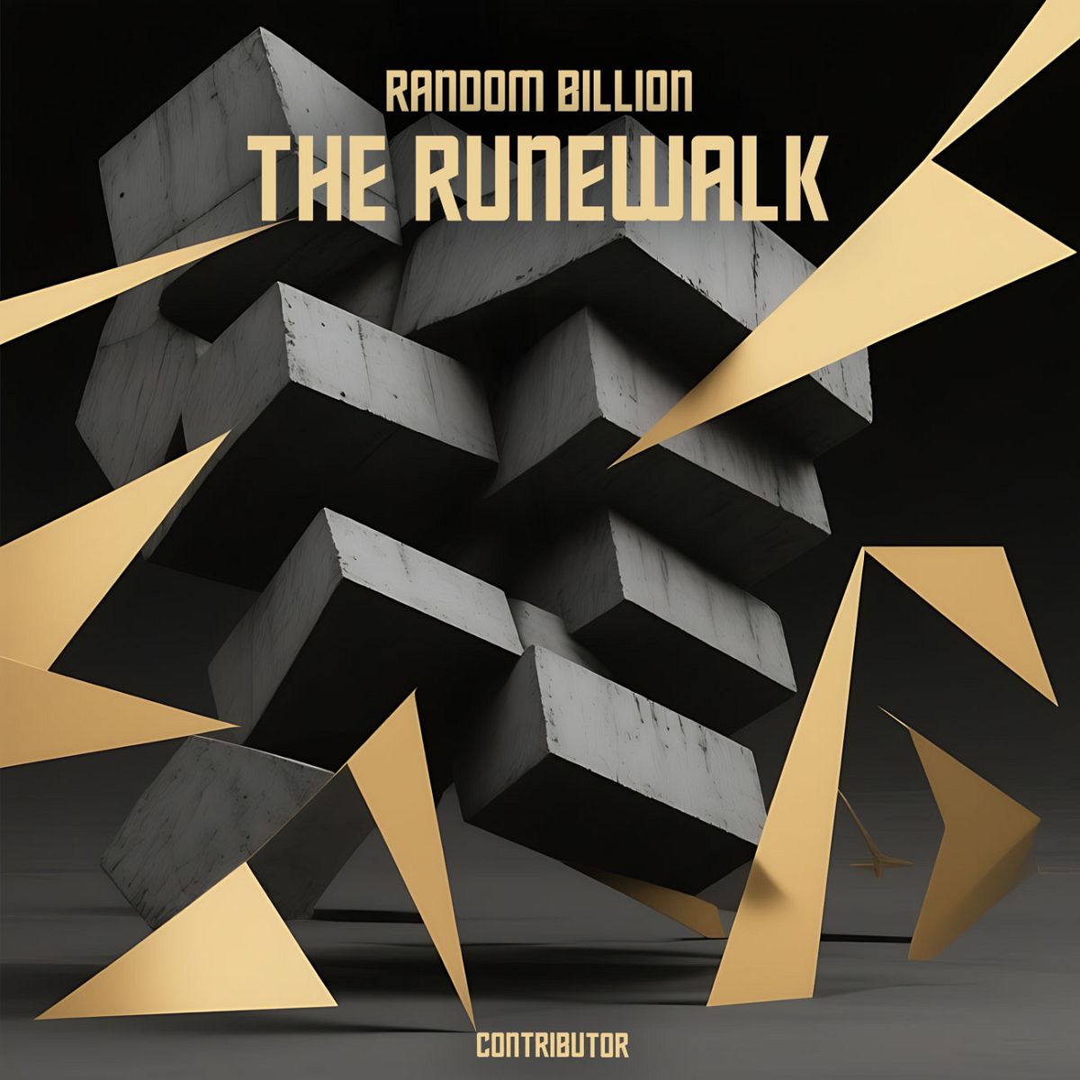 “Abstract geometric shapes with golden and gray tones, featuring interlocking 3D blocks and sharp triangular elements.”