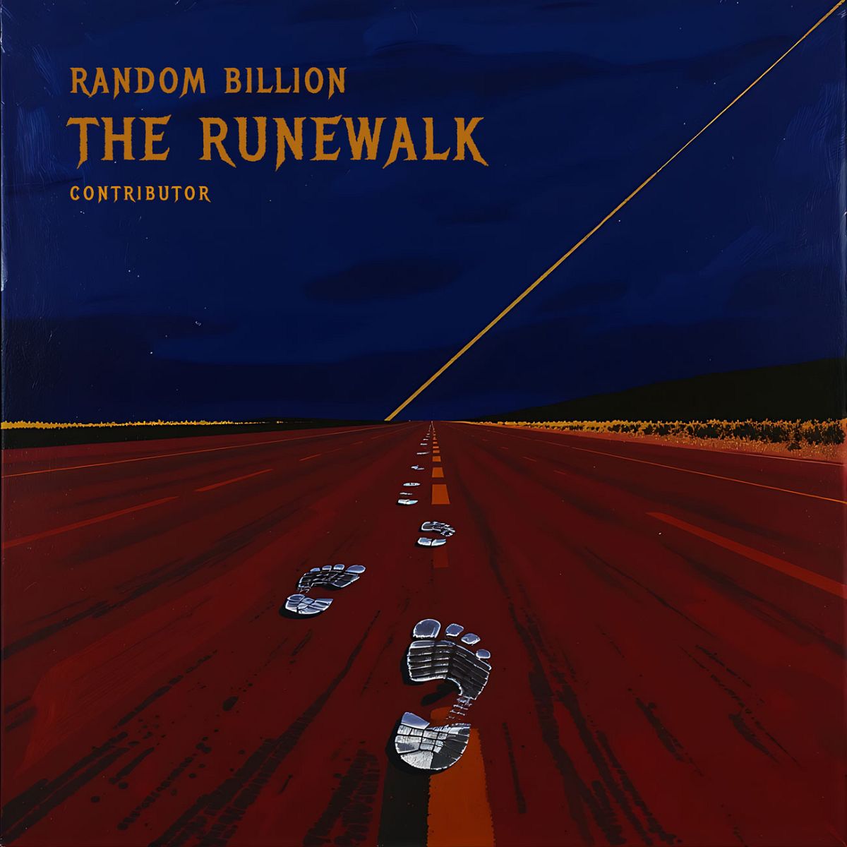 “A dark, abstract road under a night sky with glowing footsteps leading towards the horizon.”