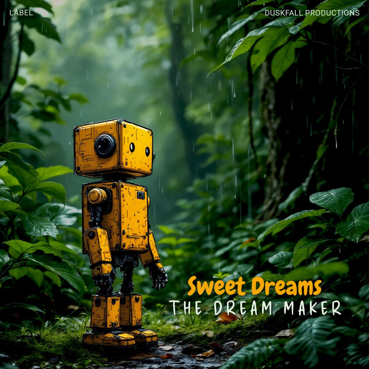 “A small, yellow robot stands in a lush, rainy forest surrounded by green foliage.”
