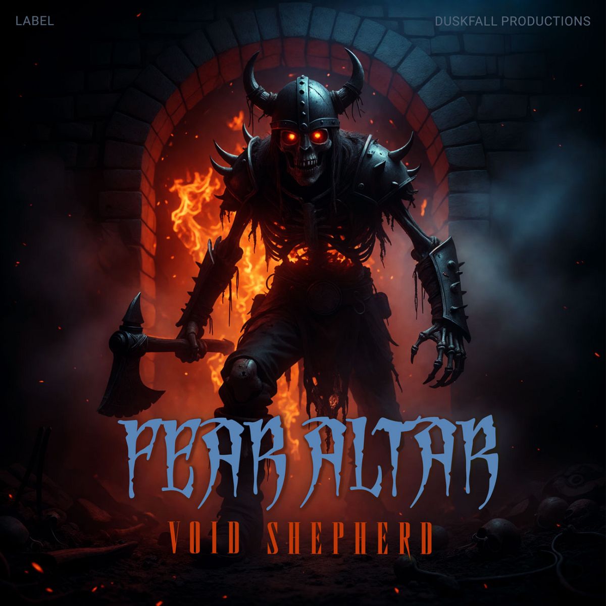 “A menacing skeleton in armor with horns stands in front of a fiery arch, wielding a weapon. Dark, ominous atmosphere.”