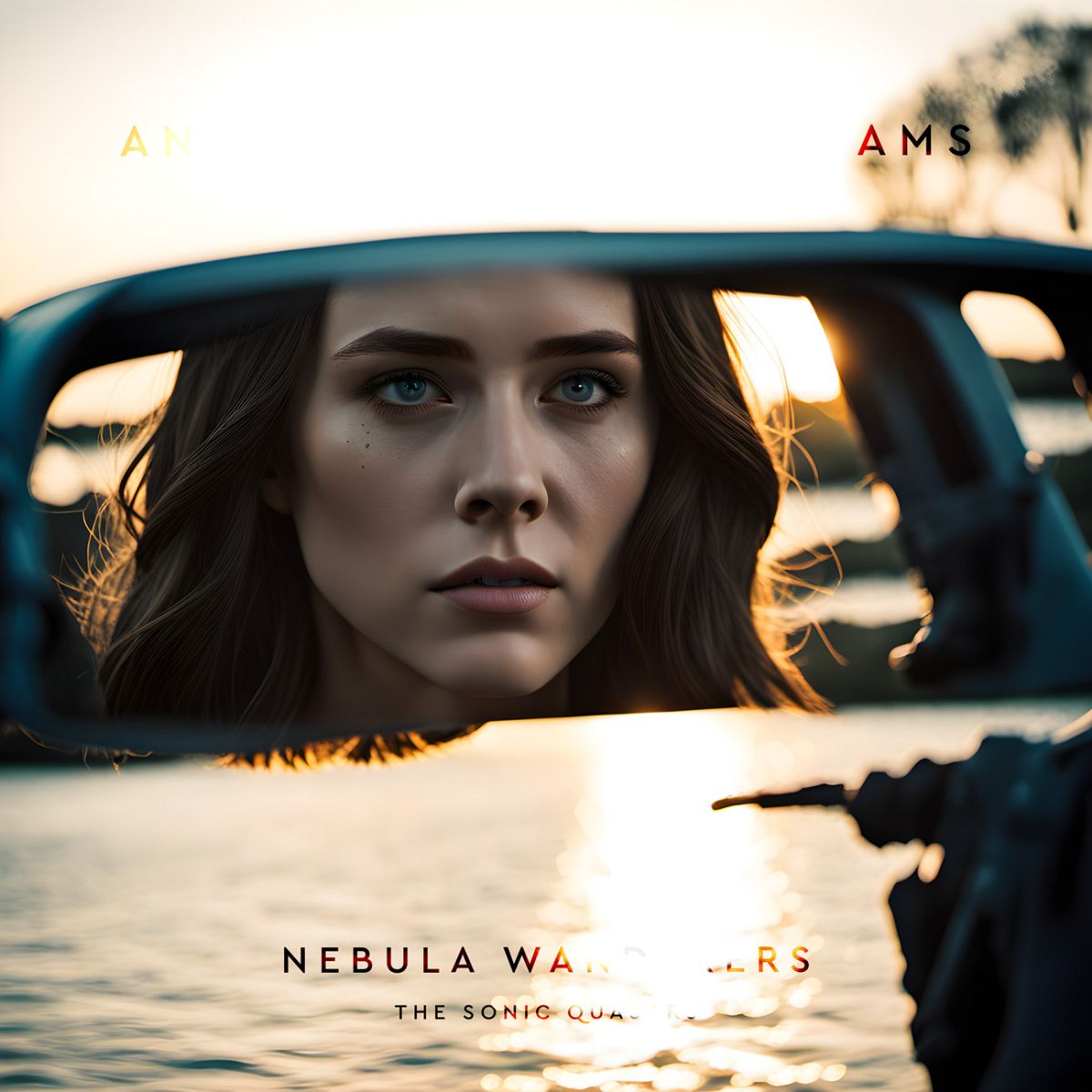 “A woman's face is reflected in a car side mirror with a scenic sunset over water in the background.”