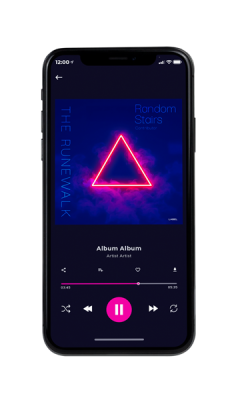 “Neon triangle glows against a smoky dark blue background.”