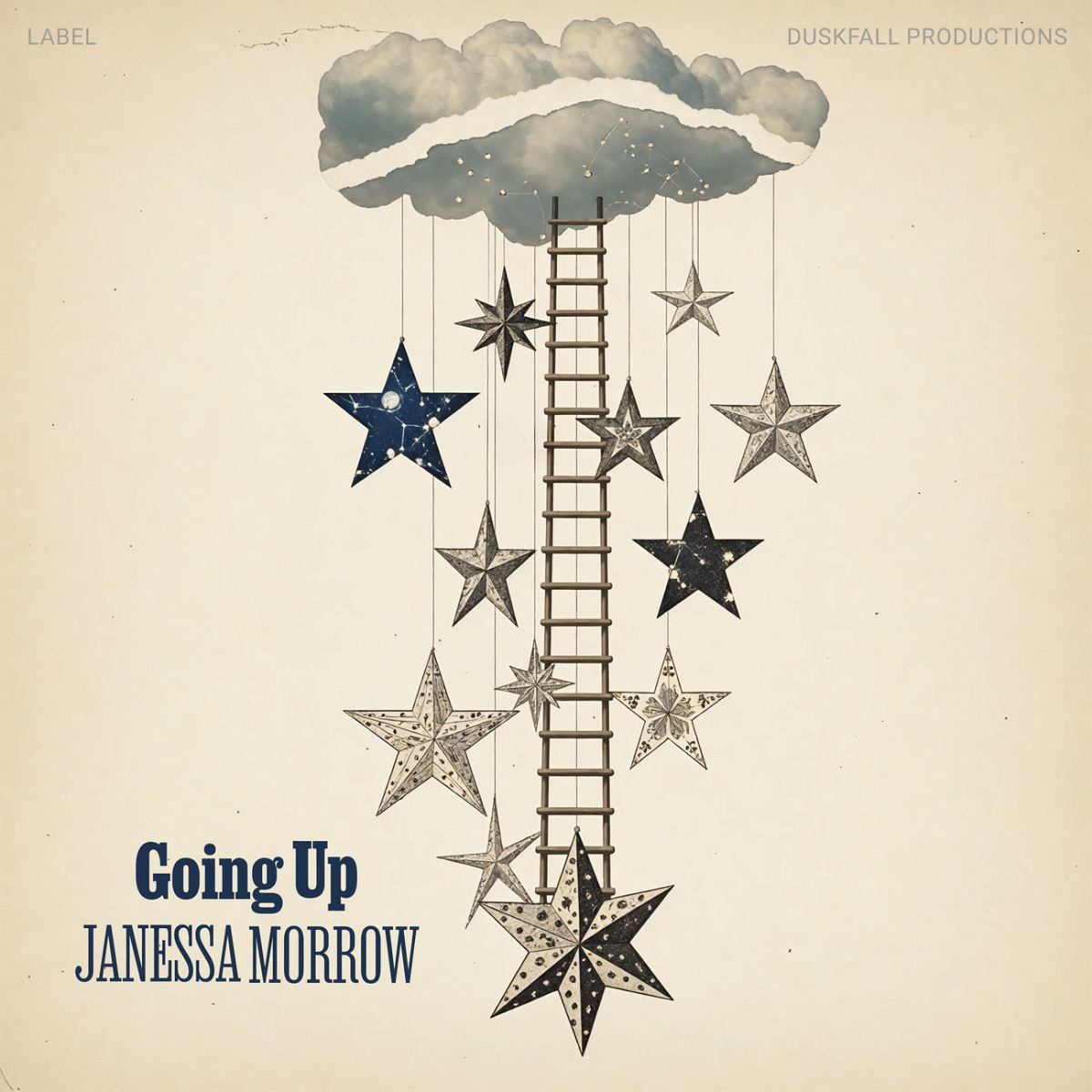 The most popular tags describing this Indie & Folk Music premade album cover are illustration, fantasy, vintage, artistic, surreal, and other keywords relevant to this premade cover are stars, serene, night sky, mystical, floating, cloud, decorative, celestial, creative, whimsical, dreamscape, paper art, ladder, ascent.
