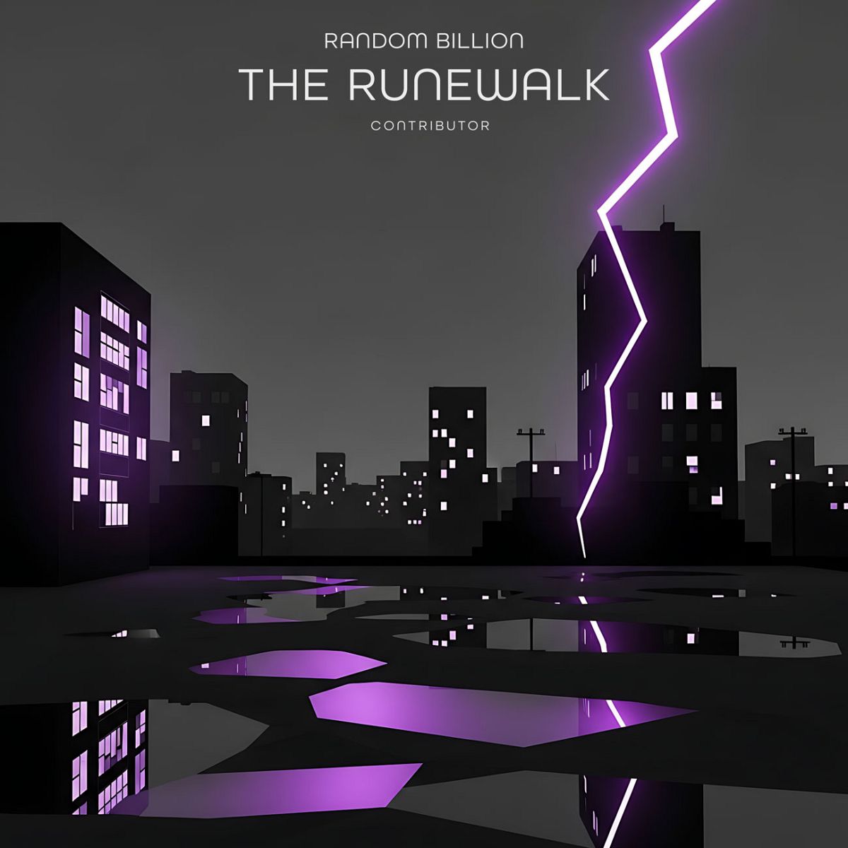 “Cityscape at night with neon purple lightning and reflected puddles.”