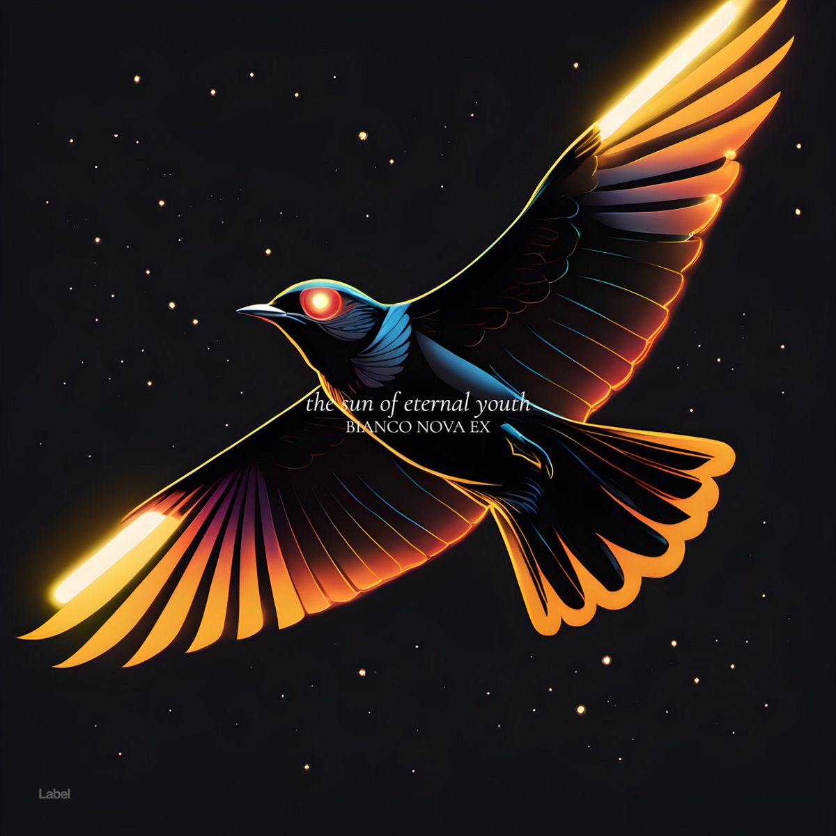 “A colorful, glowing bird with vibrant wings soaring against a dark background with scattered stars.”