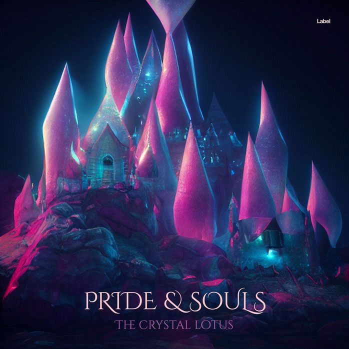 “a futuristic castle with pink and blue lights”