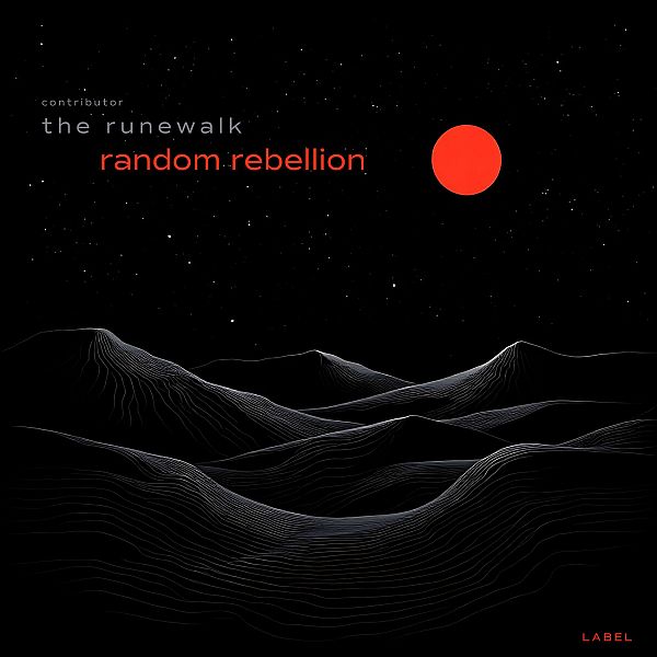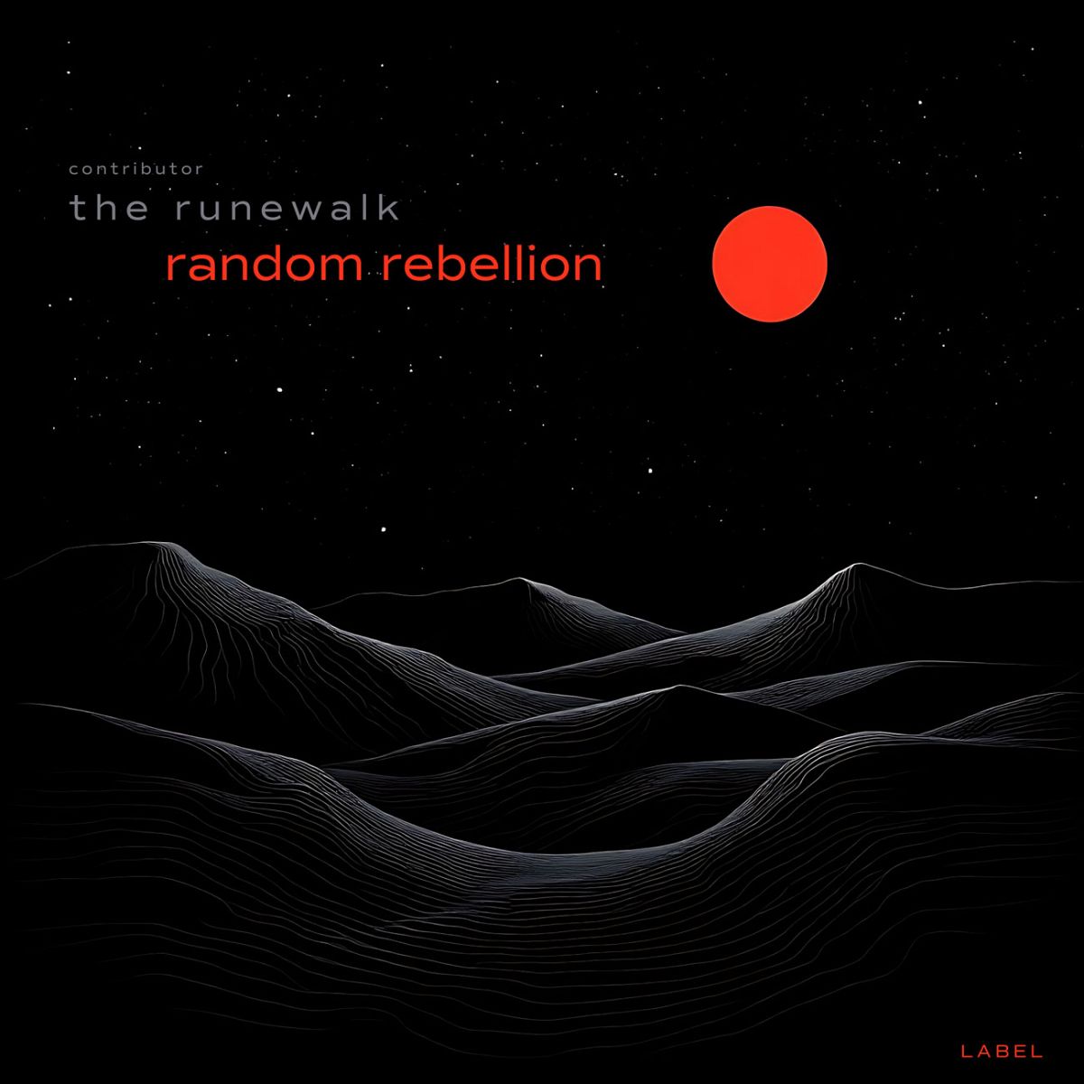 “Black landscape with white contour lines, a red sun, and a starry sky.”