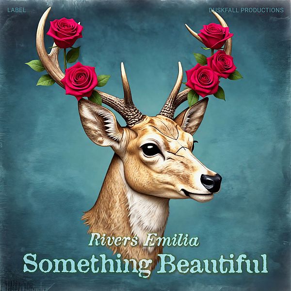 “A deer with roses on its antlers set against a teal background.”
