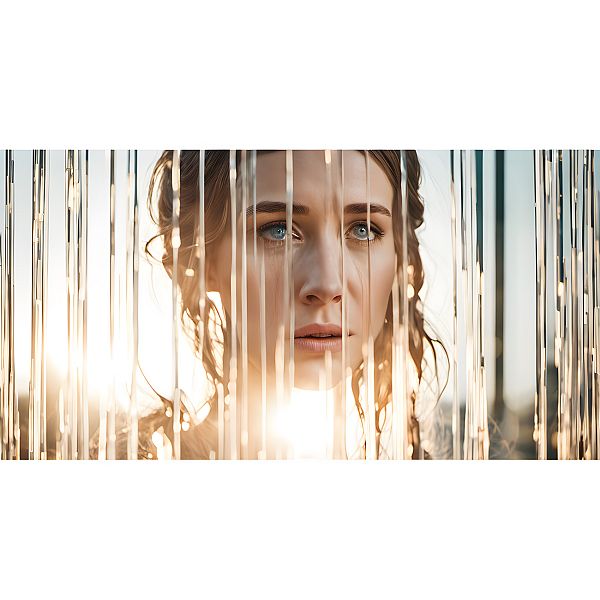 “Woman gazing through translucent strands with sunlight behind her, creating a serene and dreamy atmosphere.”