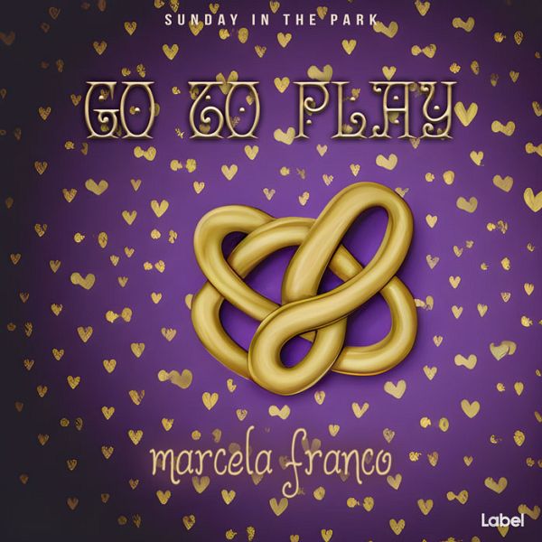 “a purple and gold poster with hearts on it”