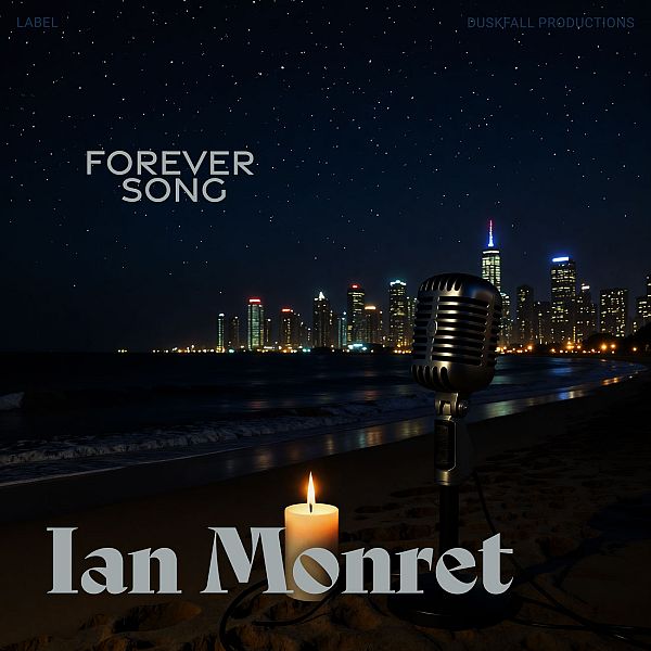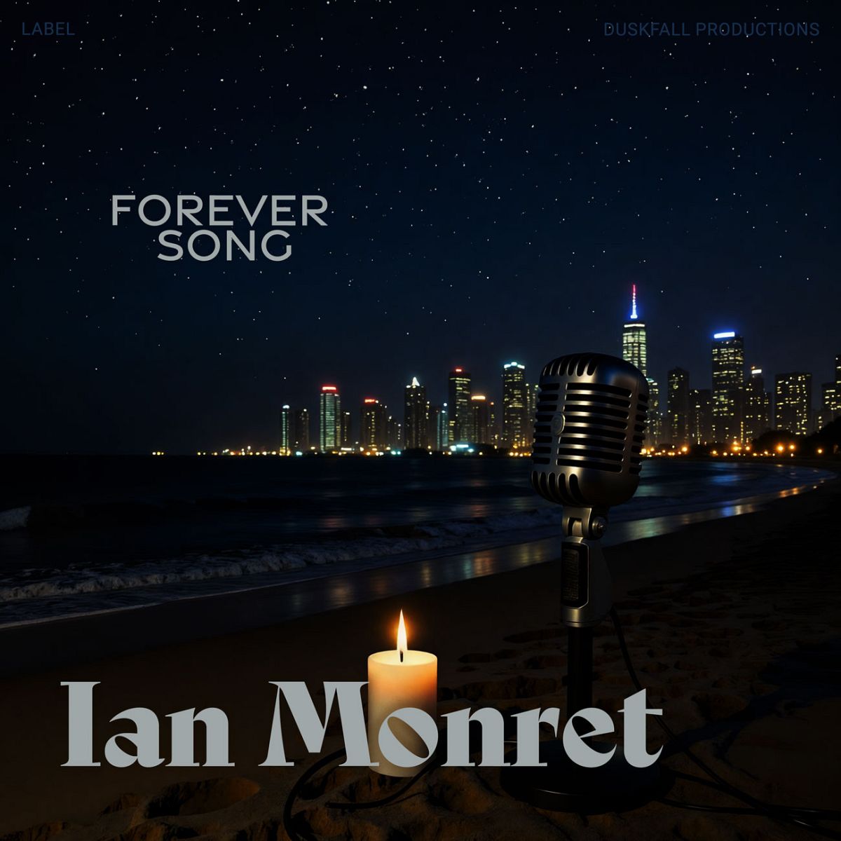 “A vintage microphone and candle on a beach at night, with a city skyline and starry sky in the background.”