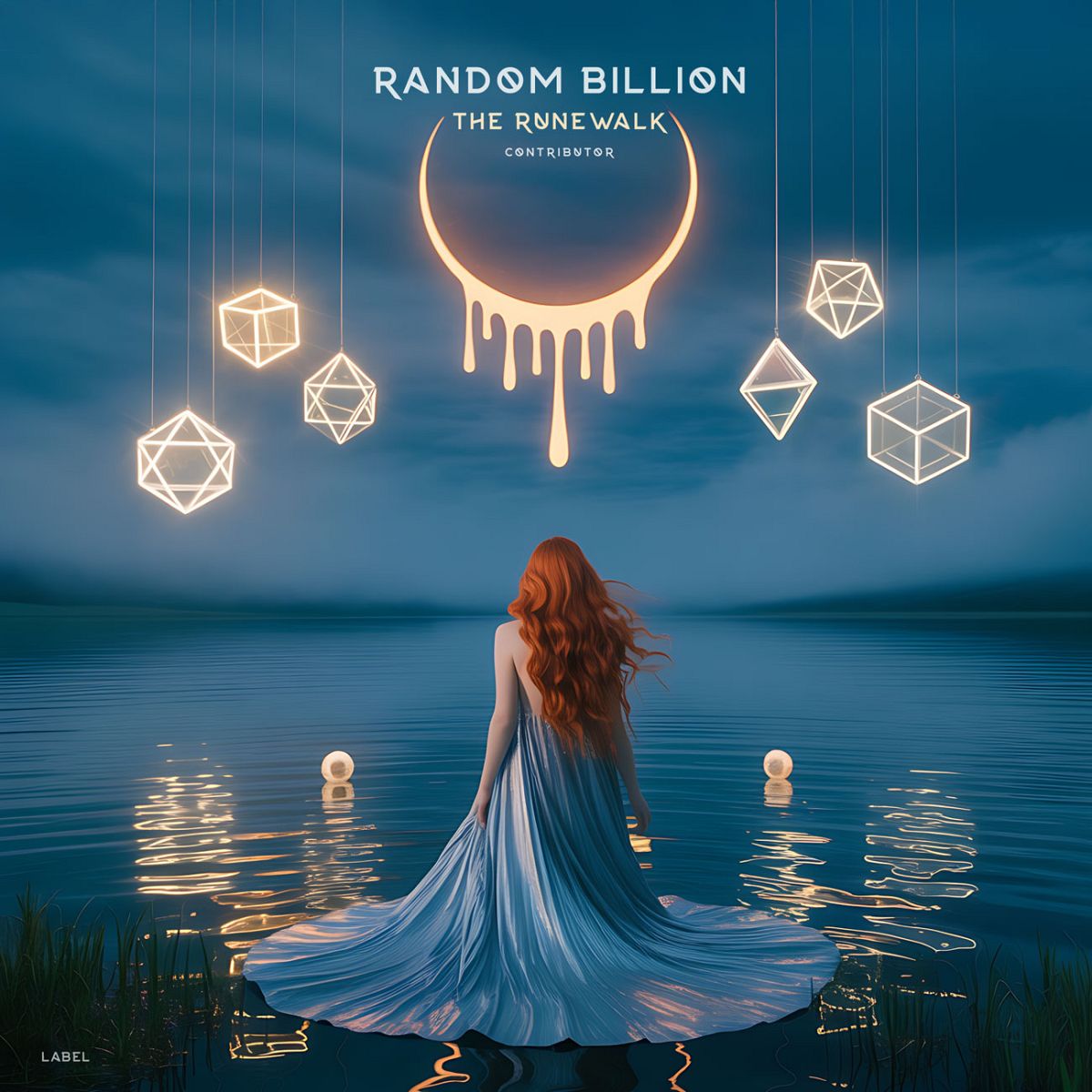 “A woman in a flowing dress stands at the water's edge, with glowing geometric shapes and a crescent above.”