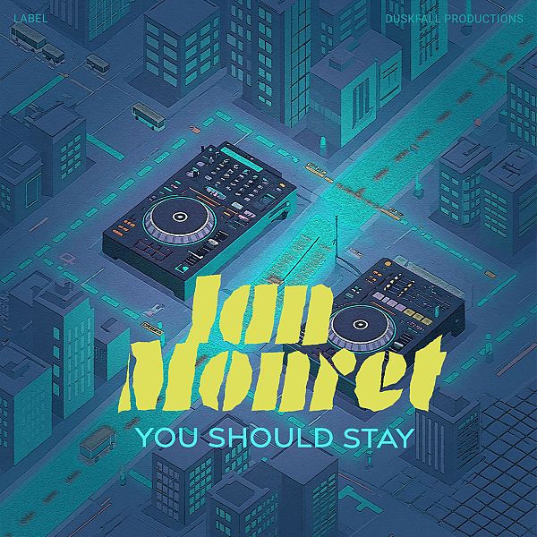 “Isometric night city grid with glowing neon roads and rooftop DJ turntables replacing buildings amid scattered vehicles.”
