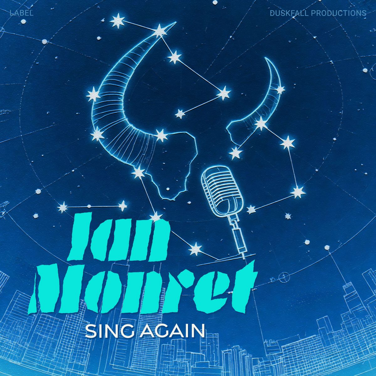 “Constellation art with a horned figure and a microphone against a starry blue background.”