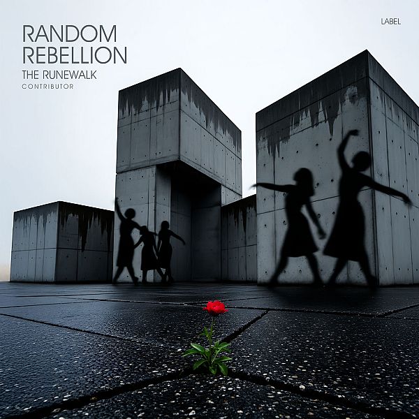 “Futuristic concrete structures with silhouettes of dancing figures, a single red rose growing on a wet pavement.”
