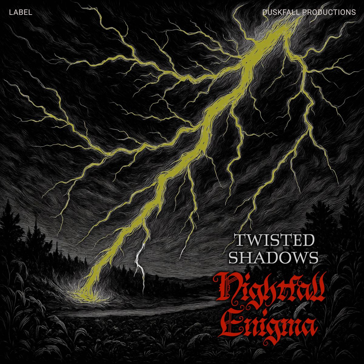 “A jagged yellow lightning bolt illuminates a dark, eerie forest landscape.”