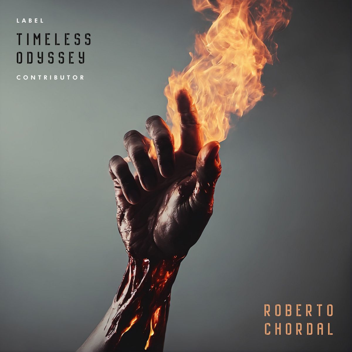 “A hand covered in a dark liquid is reaching upward with flames emerging from the fingers against a gray background.”
