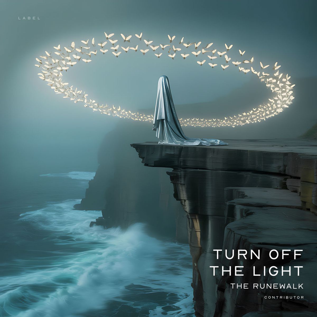 “A cloaked figure stands on a cliff edge surrounded by a ring of glowing birds against a misty, dramatic landscape.”