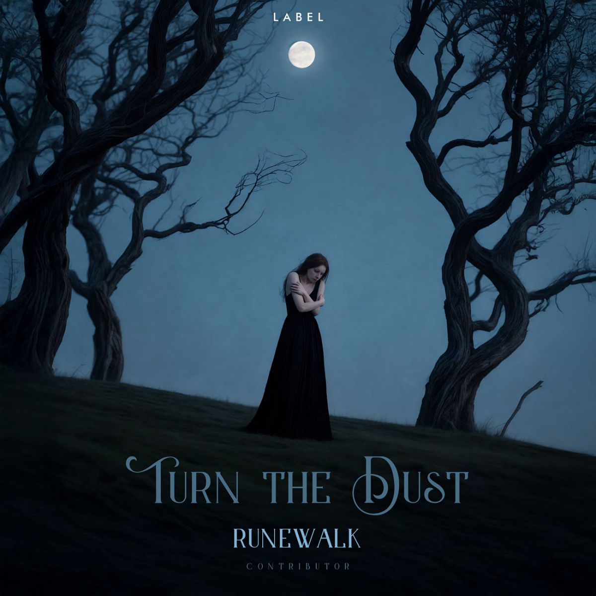 “A solitary woman in a dark dress stands among twisted, leafless trees under a moonlit, moody sky.”