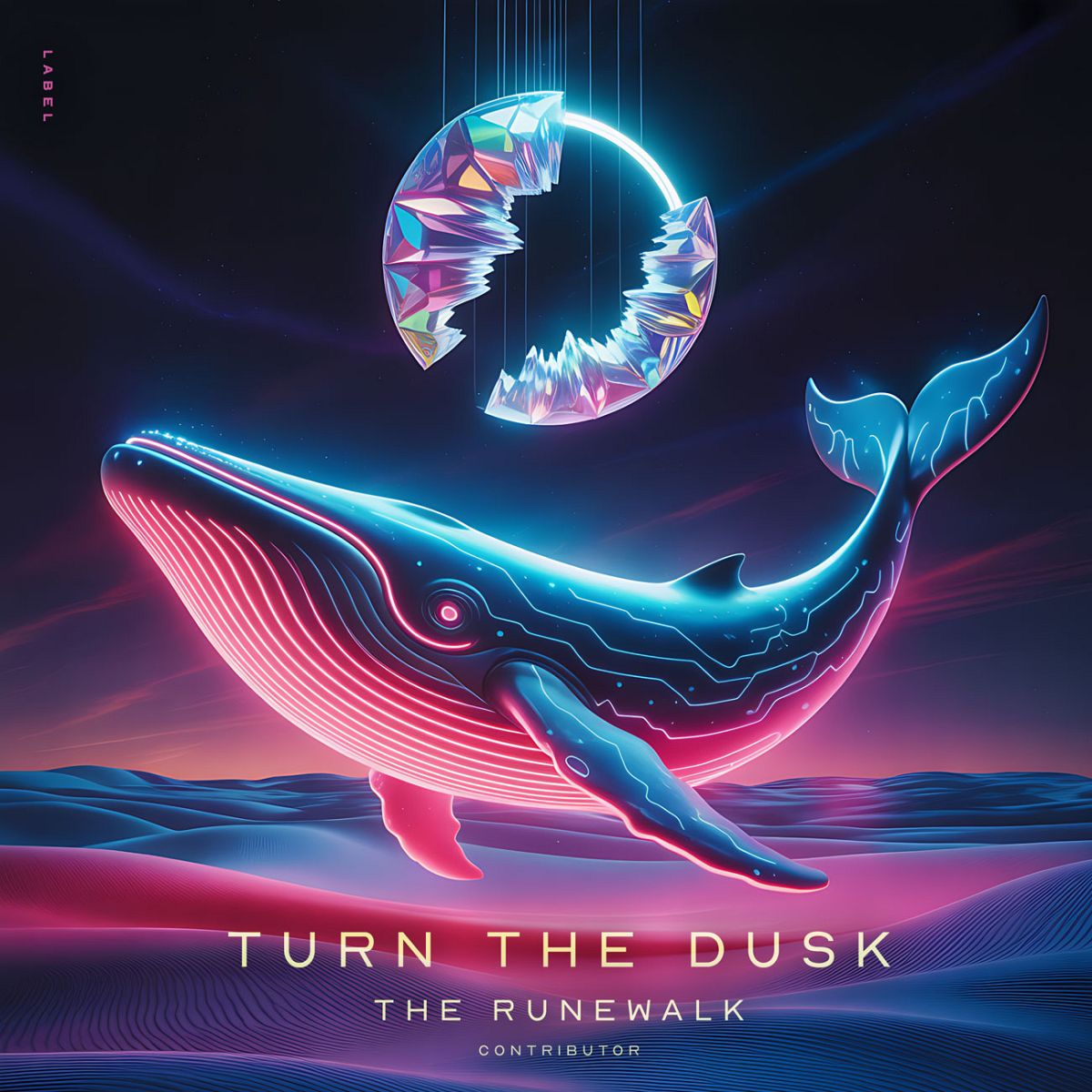 “A neon glowing whale beneath a fractured, illuminated ring in a futuristic, abstract landscape.”
